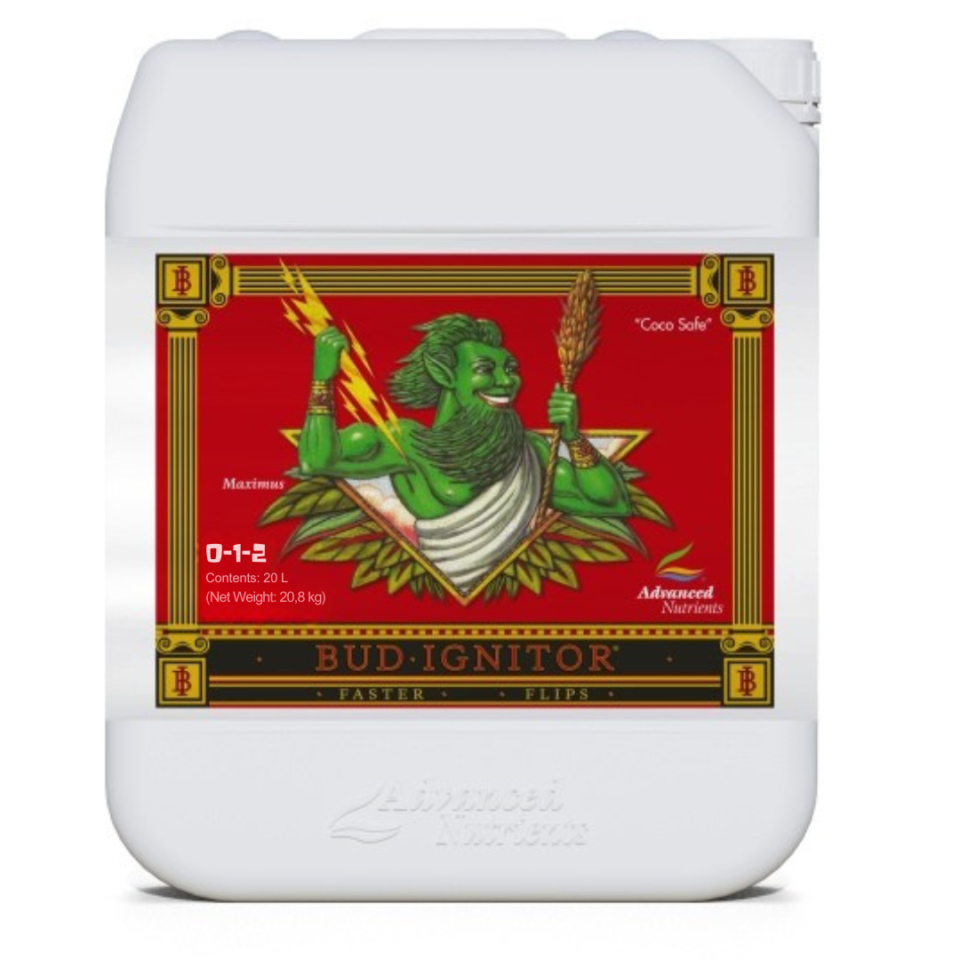 El Advanced Nutrients Bud Ignitor es un suplemento potenciador de la floración especialmente formulado para usarse solo durante las dos primeras semanas tras el cambio de fotoperiodo. Su acción activa la floración y detiene progresivamente el crecimiento vegetativo, acortando las ramas y reduciendo la distancia internodal.