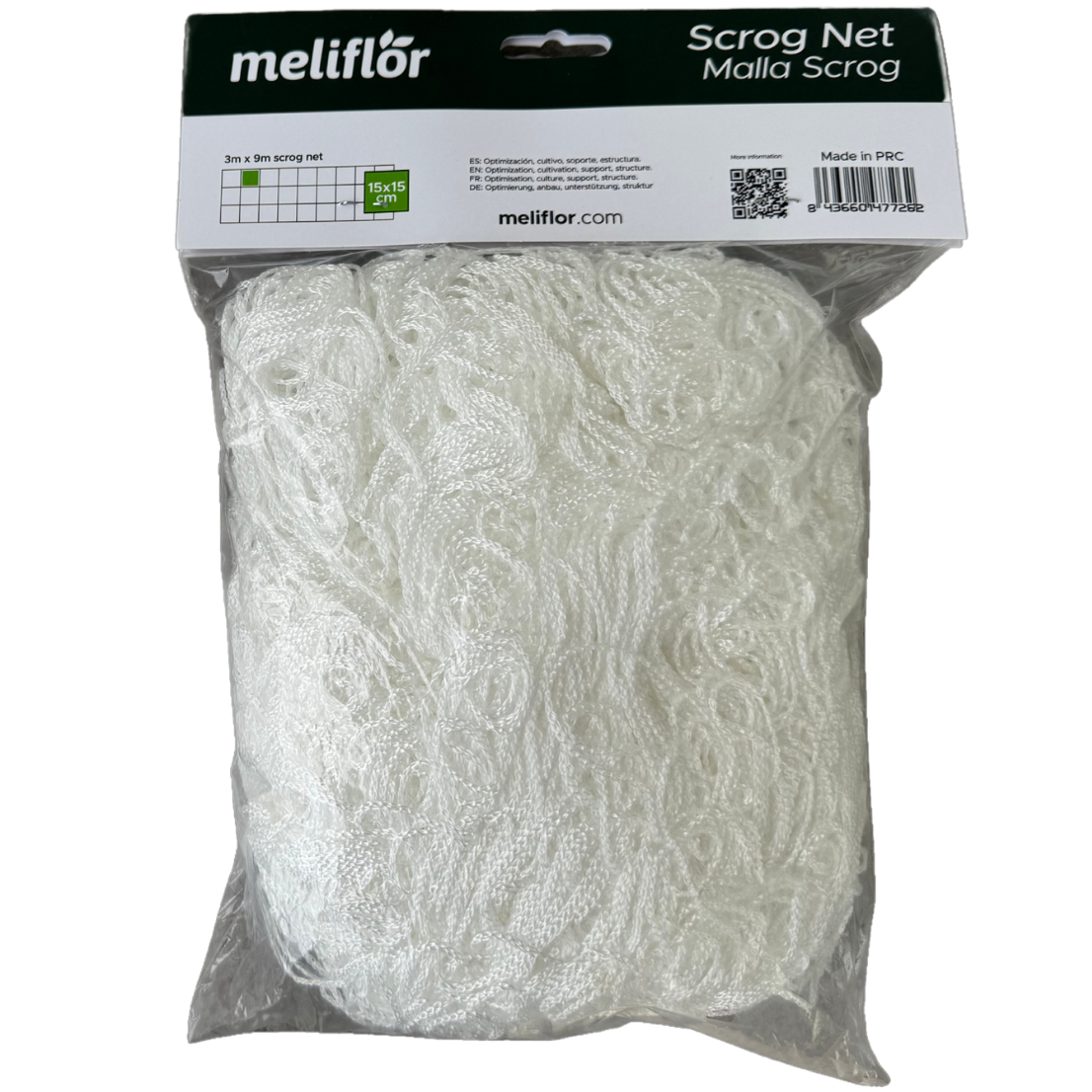 Fabricada con material textil no elástico, la Malla Scrog Meliflor proporciona el soporte necesario para que las ramas se expandan horizontalmente, mejorando la distribución de la luz y el aire en el cultivo. Sus cuadros de 15 cm facilitan el guiado de las plantas sin dañarlas, asegurando que cada brote reciba la luz óptima para su desarrollo. Disponible en formatos de 1.5 x 4.5 m y 3 x 9 m, se adapta a diferentes espacios de cultivo, tanto en interior como en exterior.