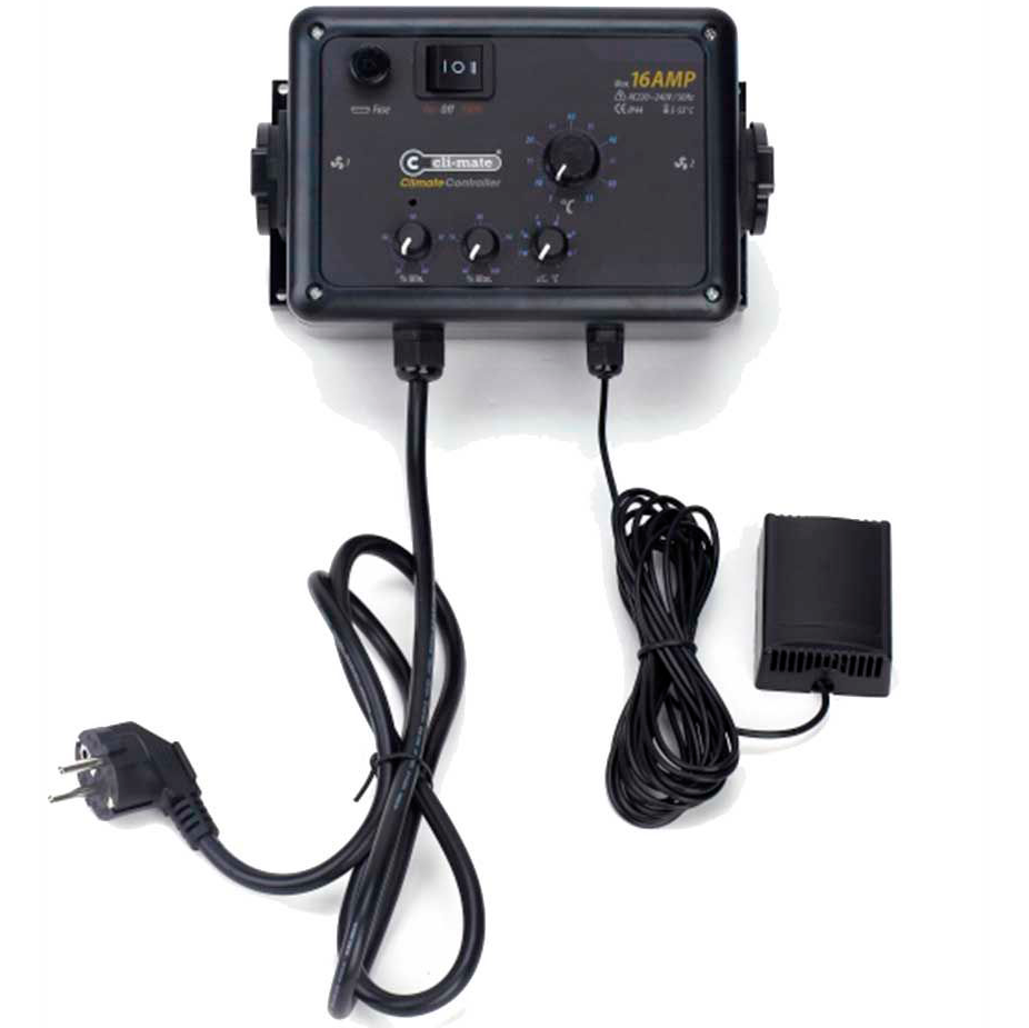 Cli-mate Controlador de Clima con Histéresis para regular de forma automática los ciclos de intracción y extracción en función de la temperatura de los sistemas de ventilación de tu cultivo.